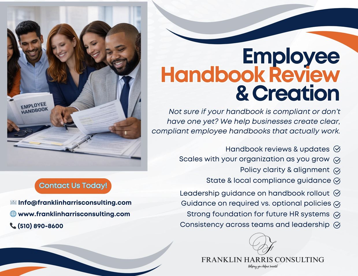 Franklin Harris Consulting offers employee handbook review and creation services tailored to your organization’s size, workforce, and regulatory environment.